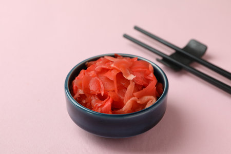 Bowl with red pickled ginger and chopsticks on pink background