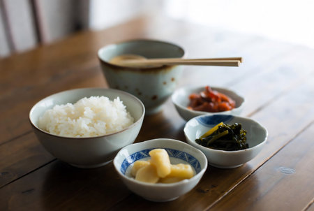 Japanese breakfast featuring miso soup and pickles