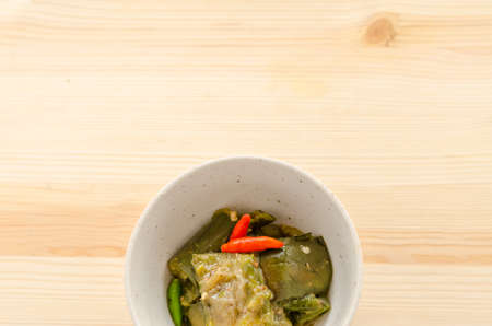 Mozuku placed on a wooden background. View from above.Mozuku is an Okinawan delicacy. It is a kind of dark, thread-like seaweed seasoned with vinegar