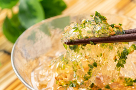 Mozuku placed on a bamboo wanchong mat. The image of Japanese food.Mozuku is an Okinawan delicacy. It is a kind of dark, thread-like seaweed seasoned with vinegar