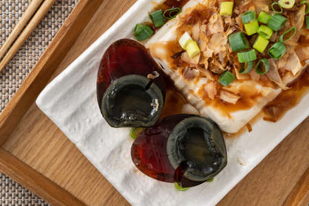 Delicious Chilled tofu and century egg food with soy sauce and bonito flakes topping in Taiwan.