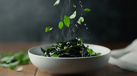Floating seaweed and algae above bowl, fresh greens and sprouts, levitated macro shot in dark moody lighting with shadows and contrast.