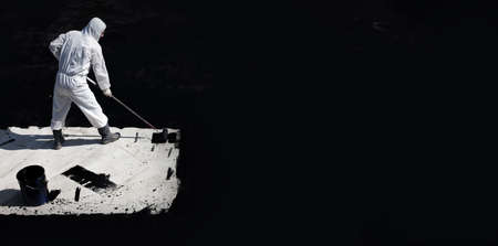 a worker overlay the tar on the flat concrete surface