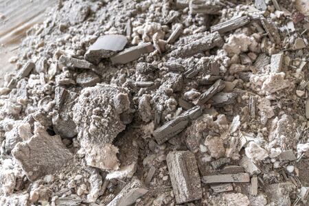 Pile of ashes after the fire went out grunge background texture. Burned out ashes close up outdoors in daylight
