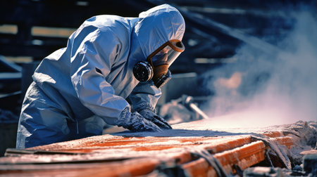 A person in a full-body protective suit and respirator is shoveling a pile of dark material, likely in an industrial or hazardous environment.