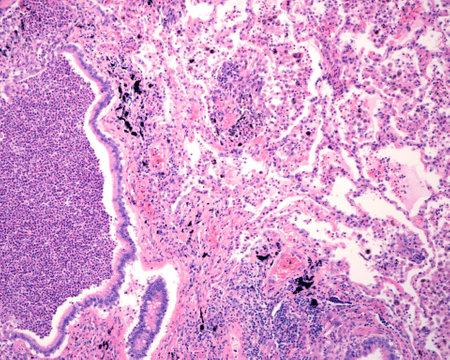 Human lung affected by an acute bronchopneumonia, commonly a hospital-acquired bacterial pneumonia. The lumen of alveoli is occupied by liquid of oedema which contains acute inflammatory infiltrates (with predominance of neutrophil granulocytes). On the right, a bronchus filled with pus.