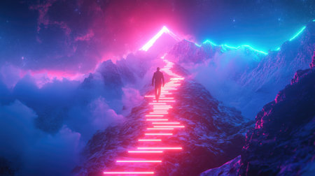A captivating scene showcasing a lone figure walking up a glowing neon pathway in a surreal mountain landscape, surrounded by vibrant clouds and cosmic beauty.