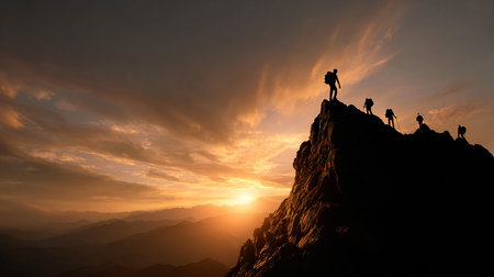 Silhouetted figures climbing a mountain at sunset, teamwork and determination