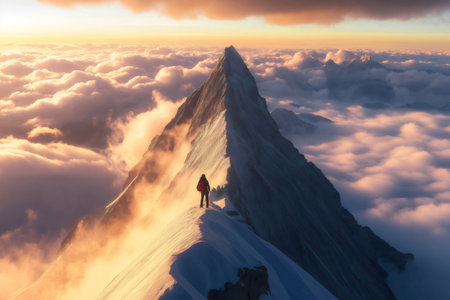 Mountaineer stands on a snowy mountain peak above a sea of clouds, enjoying a breathtaking sunset view
