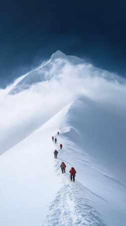 Adventurers trekking through snow-covered mountain terrain, showcasing determination and the beauty of nature's peaks.