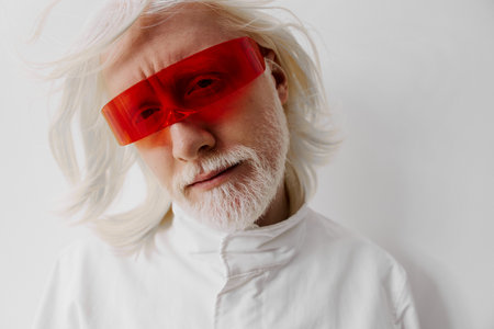 Futuristic portrait of a mature man with long white hair wearing striking red sunglasses against a plain white background, conveying a bold and unique aesthetic concept