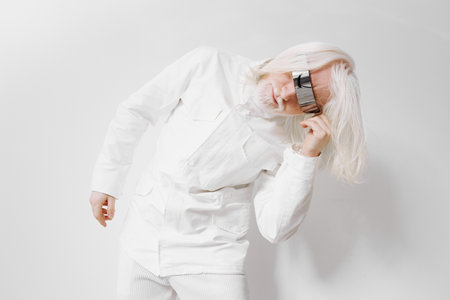 Fashionable model in futuristic attire, featuring a striking white outfit and sunglasses against a clean white background, embodying a modern and innovative style