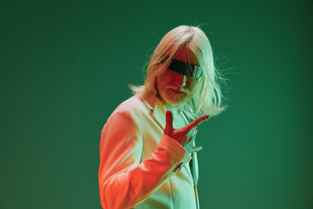 Futuristic man with long white hair in a cool suit against a green background, displaying a confident pose with sunglasses, embodying a modern, cosmic aesthetic