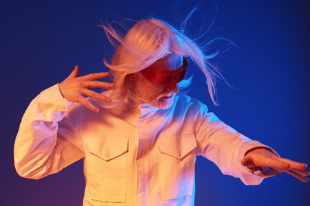 Creative portrait of a man with long white hair in a dynamic pose, wearing sunglasses, against a gradient blue and orange background, conveying energy and artistic expression
