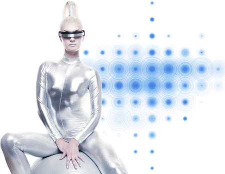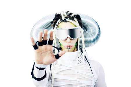 bizarre woman in silver robotic attire with sci fi sunglasses posing in lights on green backdrop
