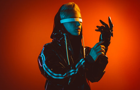 Neon portrait of woman, dressed in futuristic holographic clothes and glasses touch space by fingers. Cyberpunk girl with virtual touching pad. Neon blue and pink light. Virtual reality glasses.