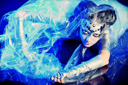 Water on the material. Studio shot in dark studio with neon light. Portrait of young girl.
