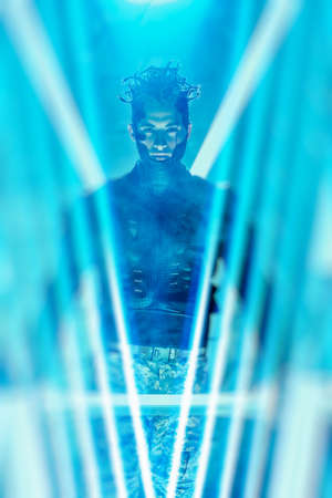 Portrait of a handsome cyberpunk warrior posing in a cyber outfit among neon lights. World of the future. Game, virtual reality.
