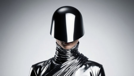 A sleek, figure dressed in reflective black clothing exudes an aura of mystery and elegance. The unique headpiece adds to its futuristic appeal, capturing attention in this artistic setting.