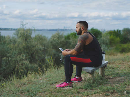 An athletic, tired boy sitting on a bench on a natural background. A man resting after training outdoors. Copy space.
