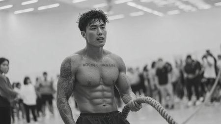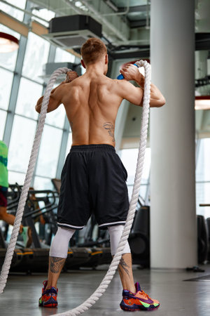 A dedicated athlete engages in rope battle training, showing visible sweat and tight abs during a challenging workout in a gym.