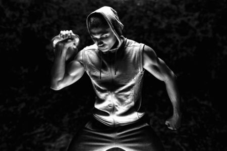 A muay thai or kickboxer training with shadow boxing outdoor