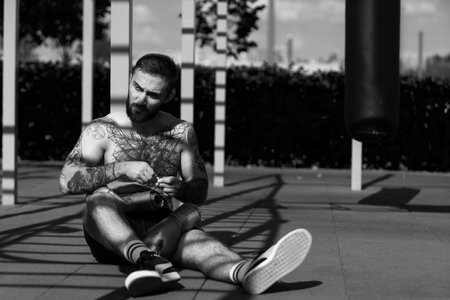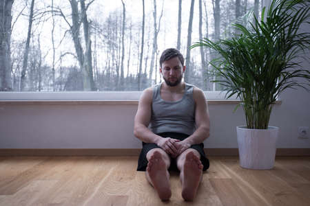 Relaxed man with a beard sits on the floor above the chrome barbell bar in the gym. He holds his hands together. There are plasters on his fingers and hands. Guy wears sportswear with white sneakers.