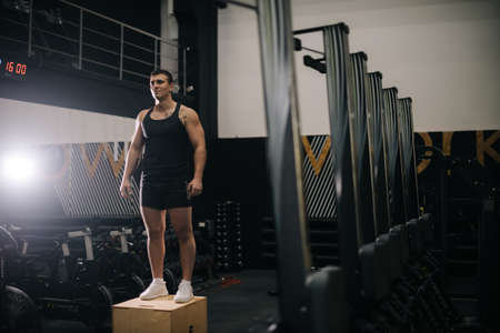 Brutal strong man with perfect beautiful body wearing sportswear standing in modern dark gym. Concept of healthy lifestyle.