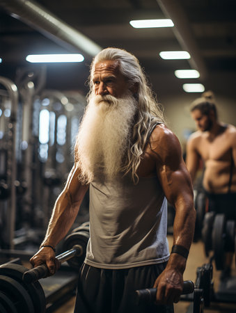Senior man with long white beard working out with dumbbell in gym. ia generated