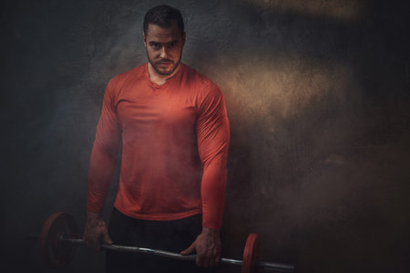 Portrait of handsome man with barbell in hands in the dark photo studio.