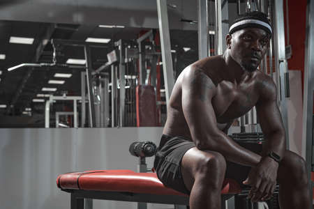 Athletic african american tired guy have a break sitting on sports bench during training in gym. Sport healthy lifestyle