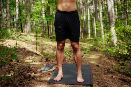 Image of a handsome cheerful young sports fitness man standing in green park nature make sport exercises for legs squats