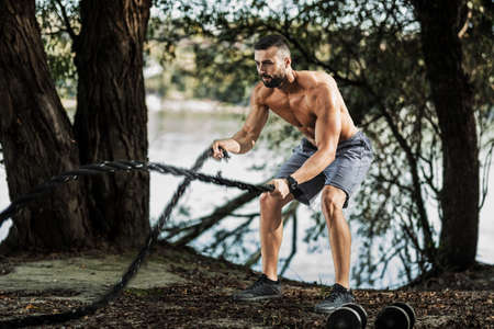 Muscular young man doing exercises with ropes in the nature, near the river.