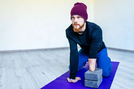 yoga instructor. fitness trainer. sport and athletic lifestyle. concentrated serene fit toned and muscular male teacher.