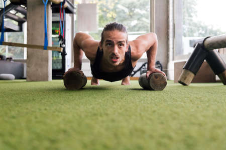 sportsman training in the gym doing push-ups, sport and active lifestyle concept, copyspace for text
