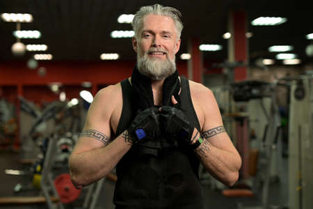 Gray-haired tattooed man posing on the background of the gym after a workout