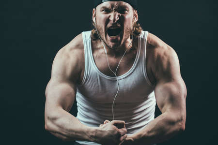 angry professional bodybuilder taking part in the competition, close up cropped photo