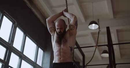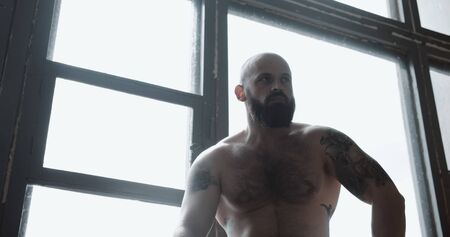 Low angle portrait of young shirtless muscular man on break after power training exercise at large gym slow motion.
