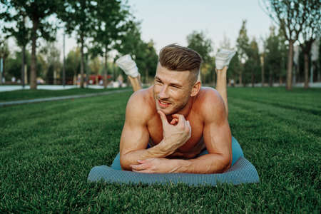 sporty man with muscular body pumping in park workout