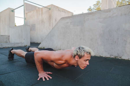 Young athletic man doing push ups outdoor.