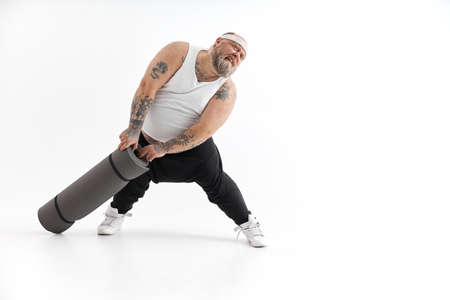 Happy fat man with big belly and tattos in sports wear with exercise mat