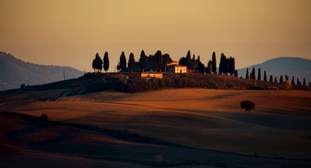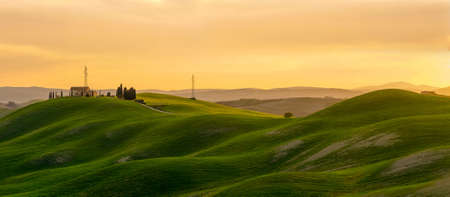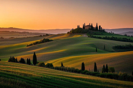 A green landscape with trees and a building in distance at scenic sunset in Tuscany, Italy