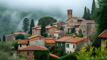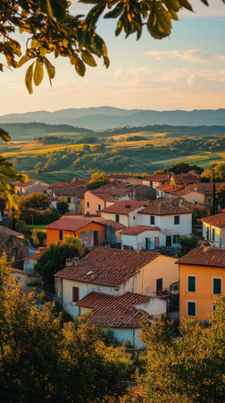 A picturesque village in Tuscany shines during sunset, showcasing charming, colorful homes with terracotta roofs surrounded by lush greenery and distant hills.