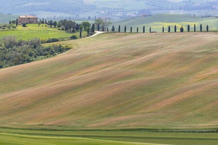 Beautiful idyllic farmland with meadow filed at Tuscany area near Pienza touristic village, Italy, Europe