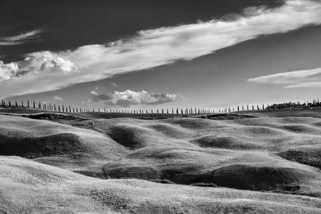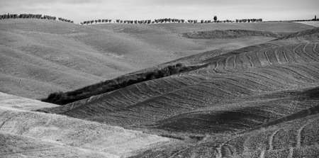 Monochrome landscape of field with cypresses in Tuscany, Italy