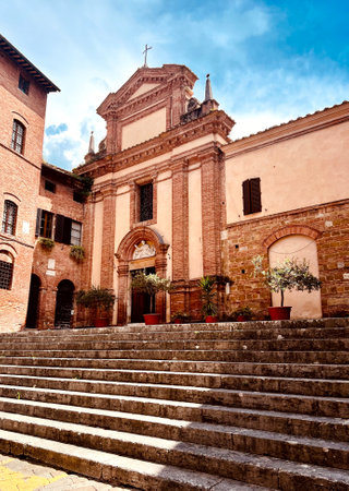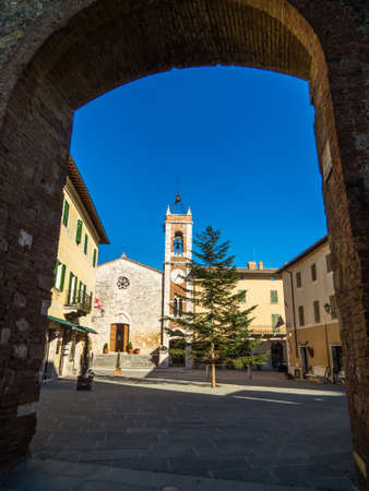 SAN QUIRICO D'ORCIA, ITALY - NOVEMBER 30, 2016: View on Piazza della Libertà (Liberty Square) and the Chiesa di San Francesco (St. Francis Church).