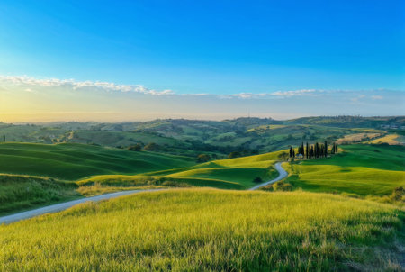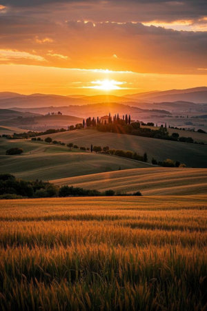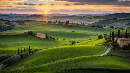 customary Tuscany farmland scene, sunset over rolling slants and Tuscany farmland. Creative resource, AI Generated