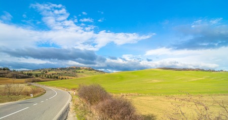 PIENZA, ITALY - January 25, 2015: street view of tuscan landscape and Pienza skyline near Pienza, Italy. In 2004 the Val dOrcia was added to the UNESCO list of World Heritage Sites.