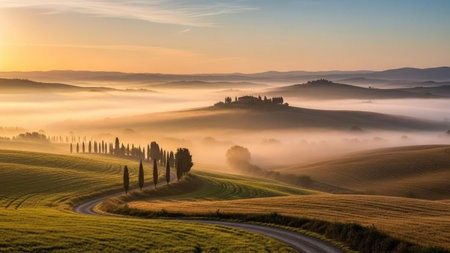Golden sunrise light illuminates rolling hills covered in mist, with fields and scattered trees creating a serene,...