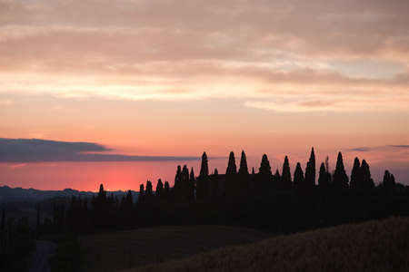 Cypress trees at sunset near Siena, Tuscany, Italy